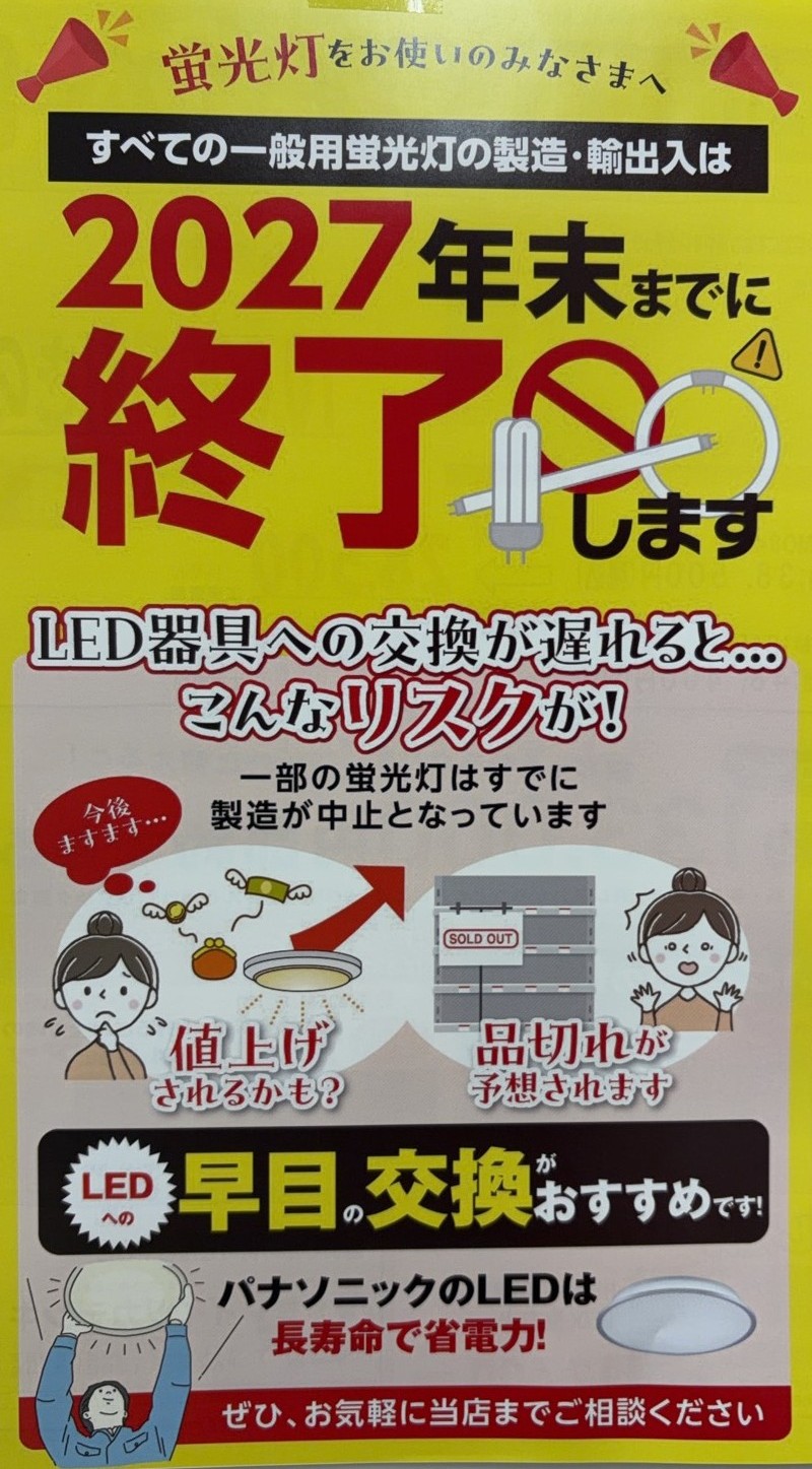 今後、蛍光灯の値上げや品切れが予想されます。